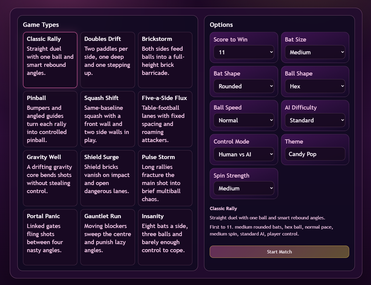 A modern take on the ancient classic. Choose from twelve modes, tune the rules, swap themes and jump into a lightweight arcade remix for some nostalgic* fun.